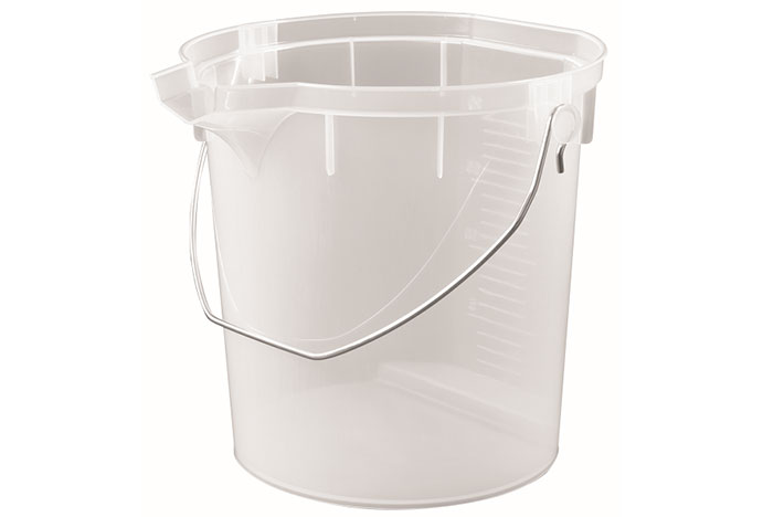 Extremely heavy-duty plastic measuring bucket.  V spout for controllable pouring, raised increments...